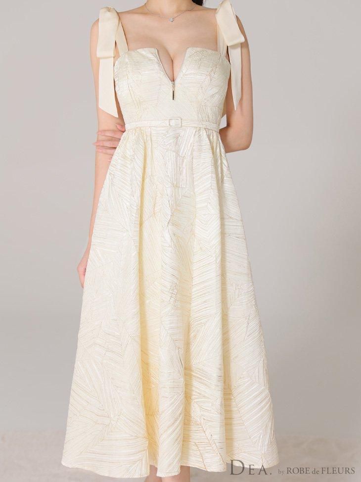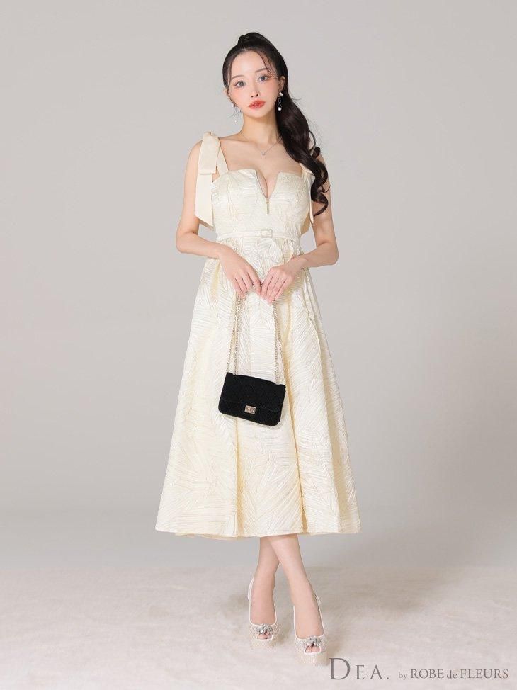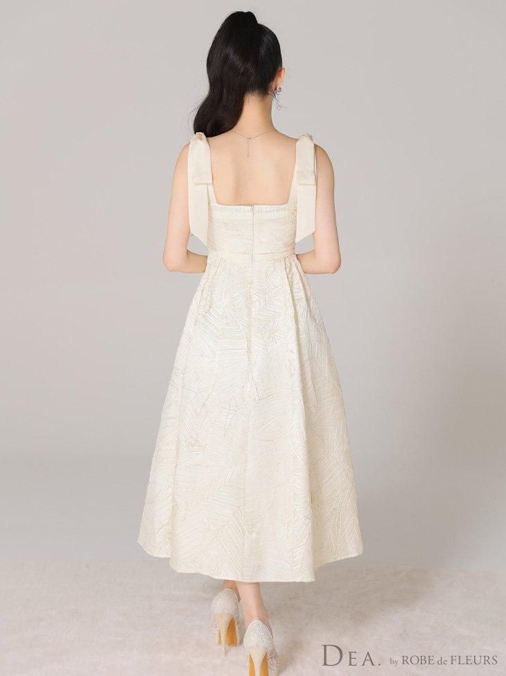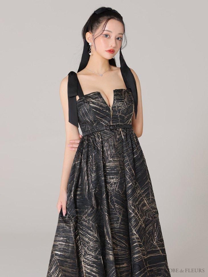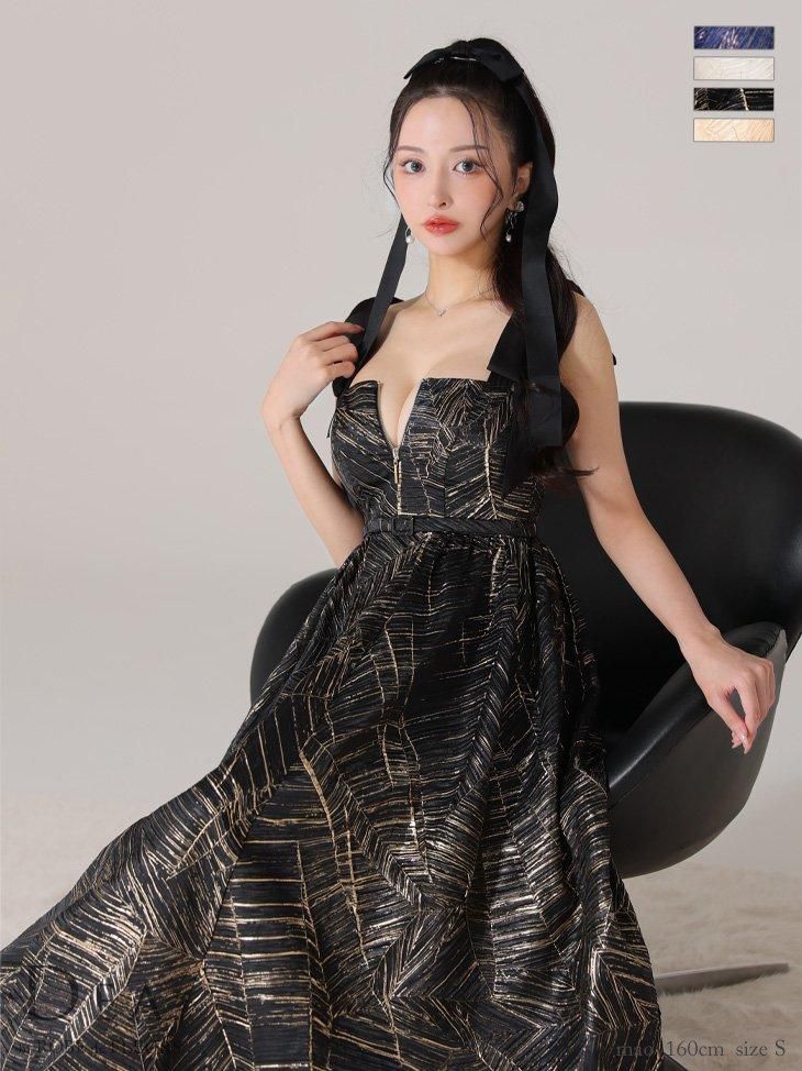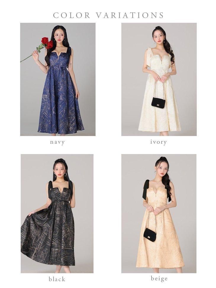 ジャガードが気品あふれるフレアロングドレス。 肩のサテンリボンがポイントです♡ ウエスト切り替えでスタイルアップ効果も♡