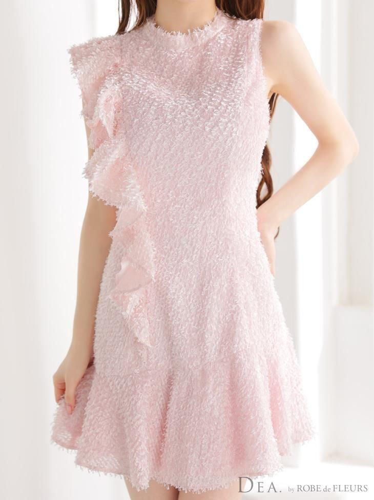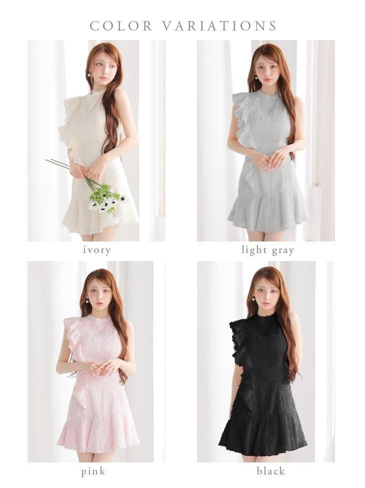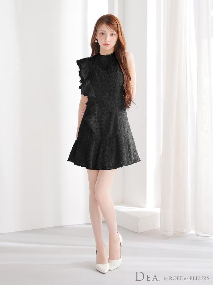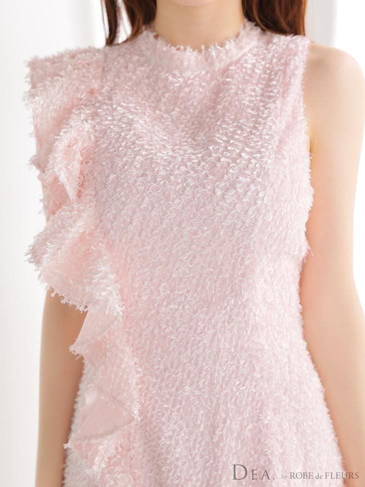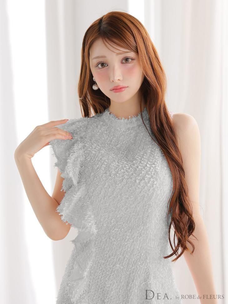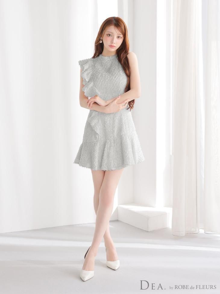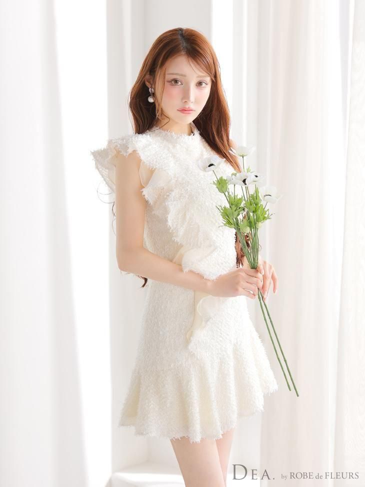 肩から裾にかけて流れるようなフリルが、動きに合わせて表情を変えるデザイン。