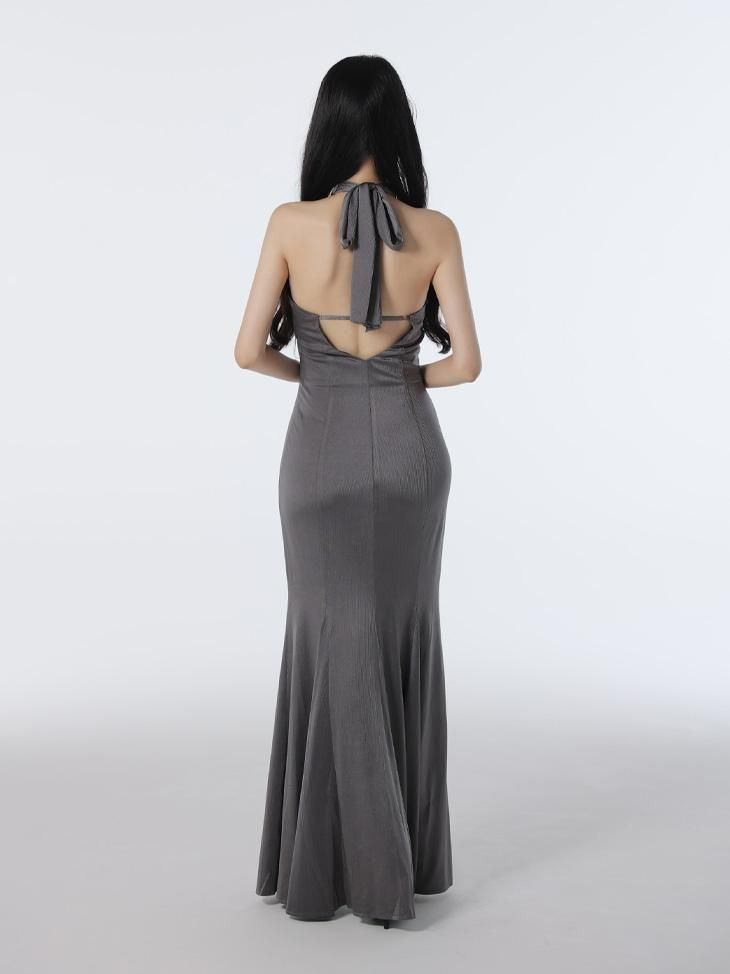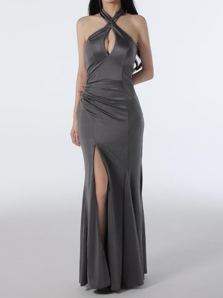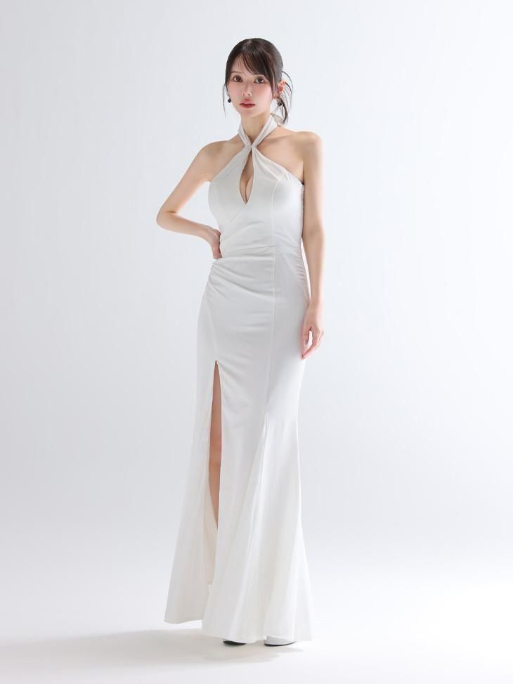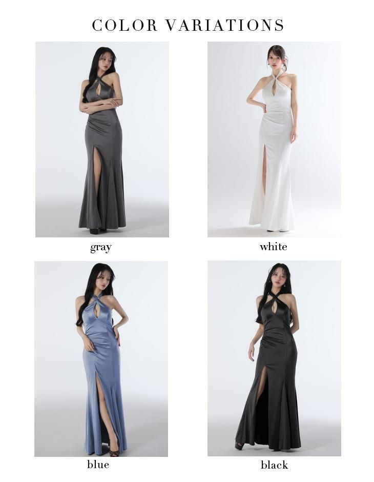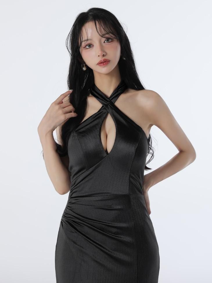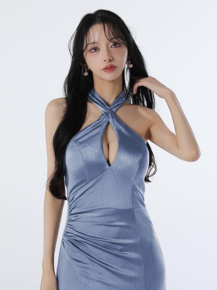 クロスデザインのホルターネックでデコルテを華やかに演出。