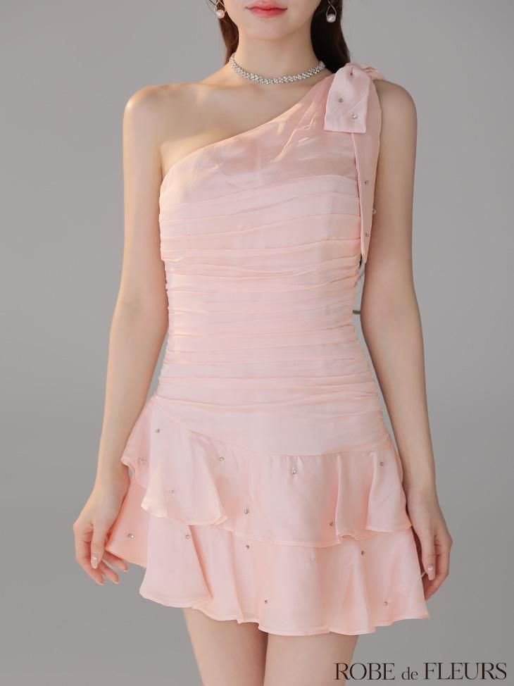 サテンにギャザーを寄せた高級感あふれるミニドレス。