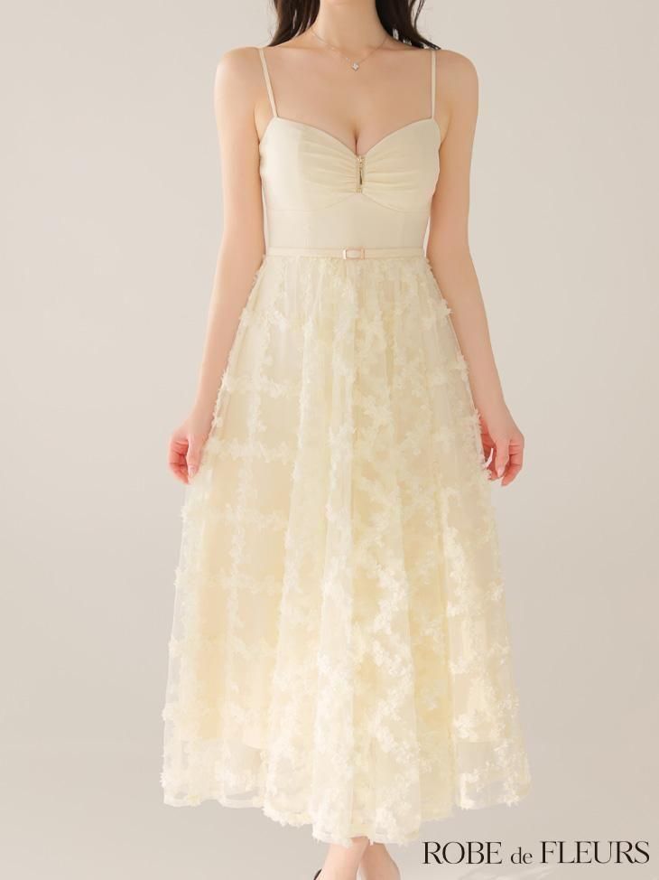ツイル生地と立体フラワーレースを組み合わせた華やかなワンピース。
