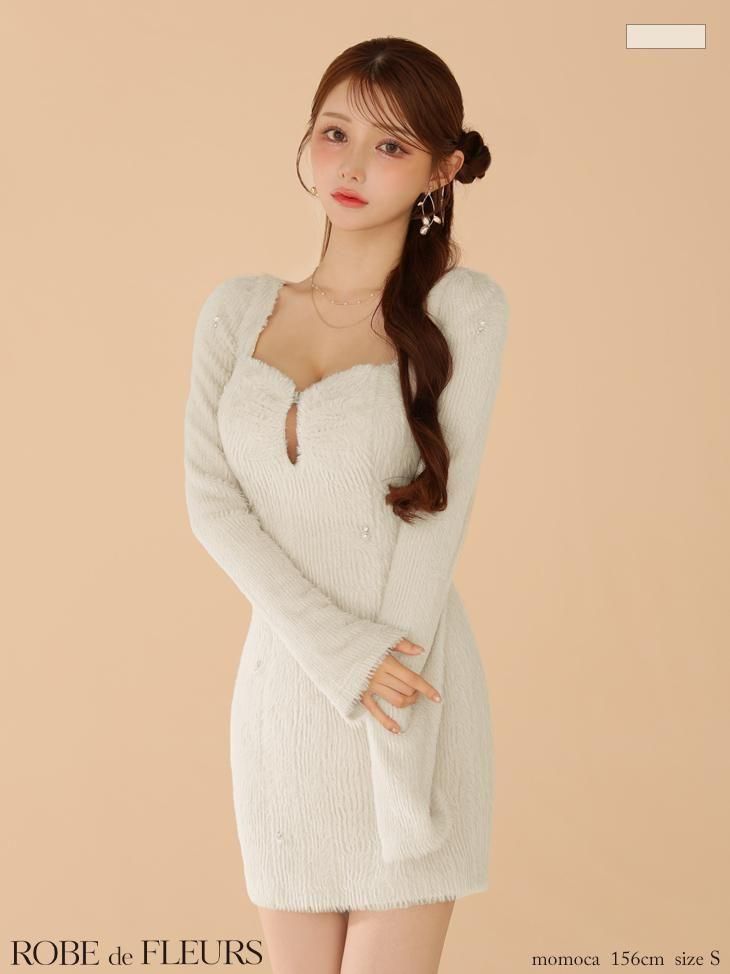 ふんわりとしたフェザーニット素材で、女の子らしい柔らかさと品のある華やかさを兼ね備える。