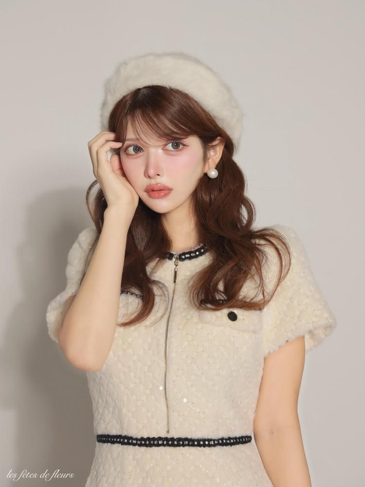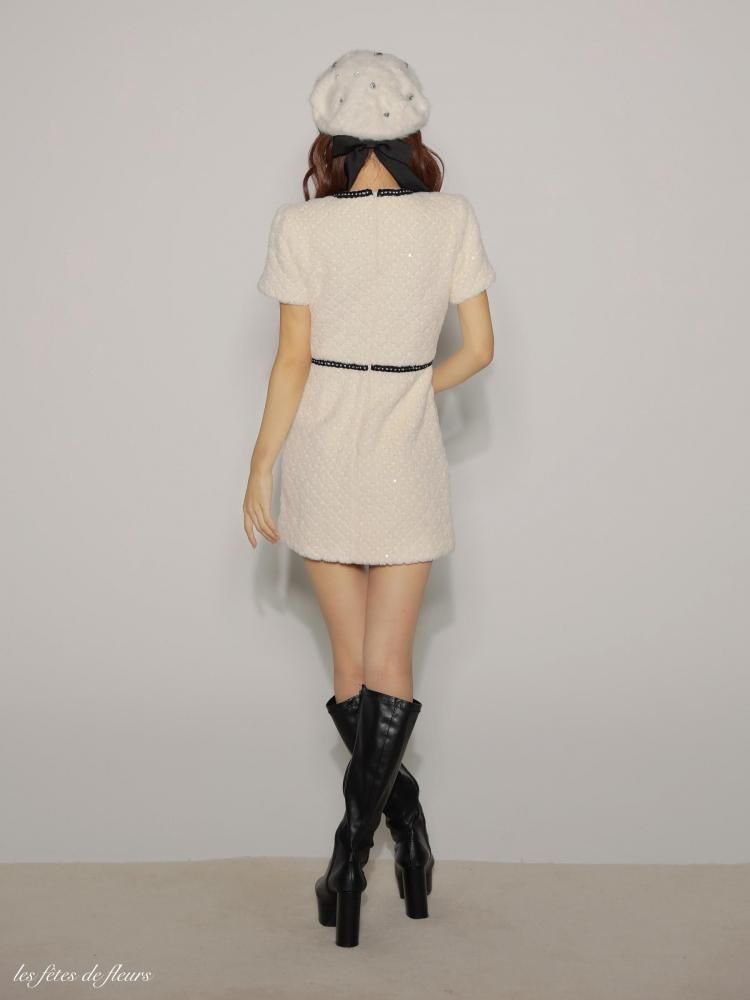 上品なラメ糸を織り込んだツイード調のニット素材を使用したミニドレス。